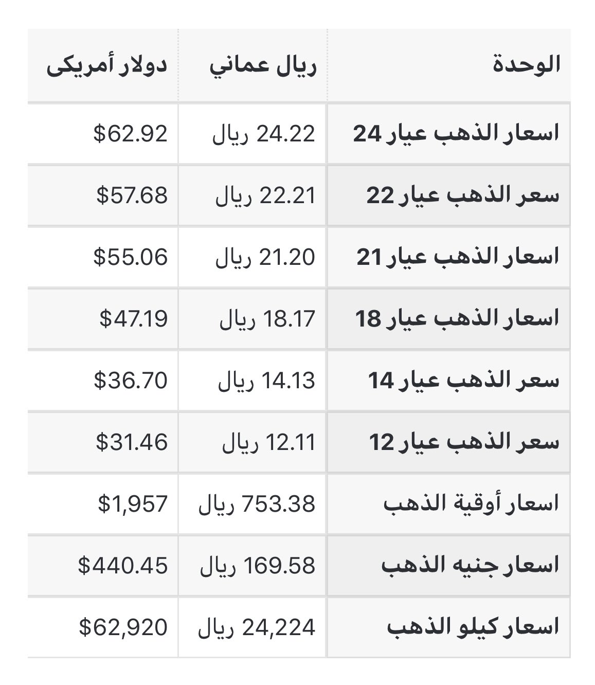 أسعار الذهب في عمان gold prices oman تحديث يومي بآخر المستجدات في الأسعار عن اليوم وطوال عام 2021 حرصنا في موقعنا على تقديم كل جديد حول تغيرات أسعار الذهب في سلطنة عمان وعرض الأسعار بصورة يومية متجددة حسب الاقتصاد العماني ونسعى إلى تقديم أفضل.